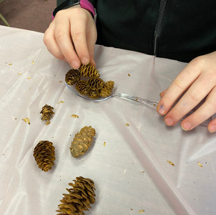From there on kids could choose which station they'd like to explore next, they quickly noticed a theme throughout the event! PINECONES! Pine cone stamping, and glittery pinecone ornaments! Of course paint and glitter are always a hit, so the children (and even some grownups) had no problem being creative and making beautiful and unique pictures and earning a stamp for their creations!